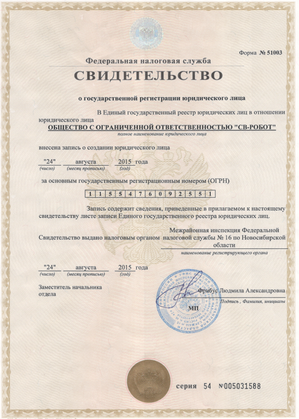 - Полное наименование организации:ОБЩЕСТВО С ОГРАНИЧЕННОЙ ОТВЕТСТВЕННОСТЬЮ «СВ-Робот»
